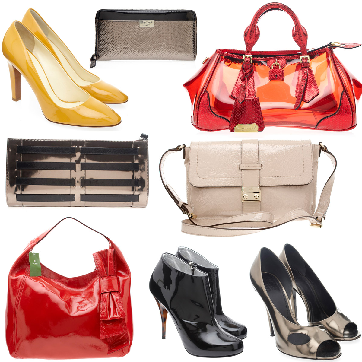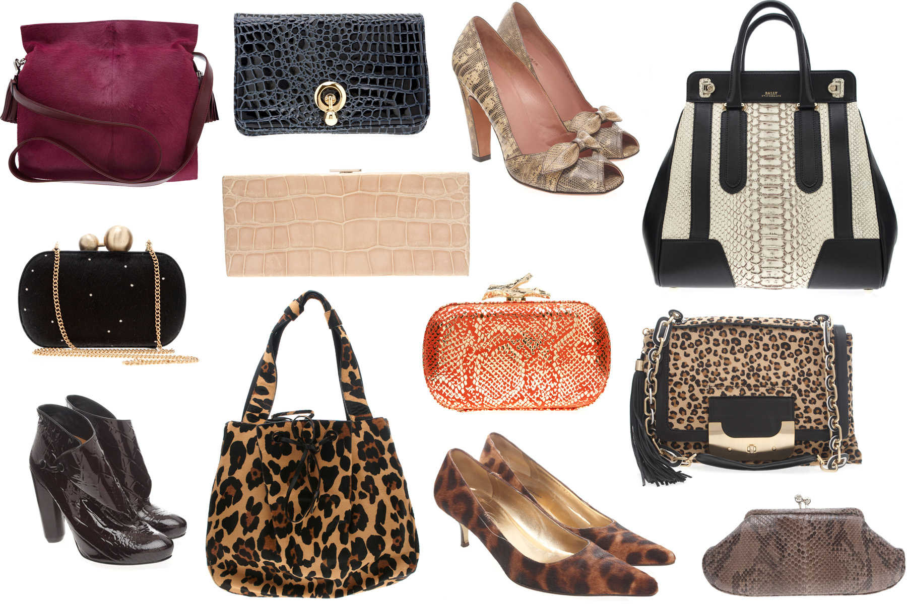 Left to right: Miu Miu heels, £105, DVF wallet, £59.50, Burberry ‘Blaze’ bag, £560, Strutt Couture clutch, £126, Mulberry bag, £315, Kate Spade bag, £175,Guiseppe Zanotti boots, £84, Givenchy heels, £105