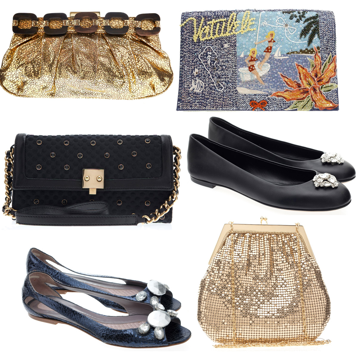 Left to right: Anya Hindmarch clutch, £175, Anya Hindmarch clutch, £105, Marc Jacobs bag, £150, Guiseppe Zanotti flats, £115.50, Anya Hindmarch flats, £87.50, Whiting & Davis bag, £105