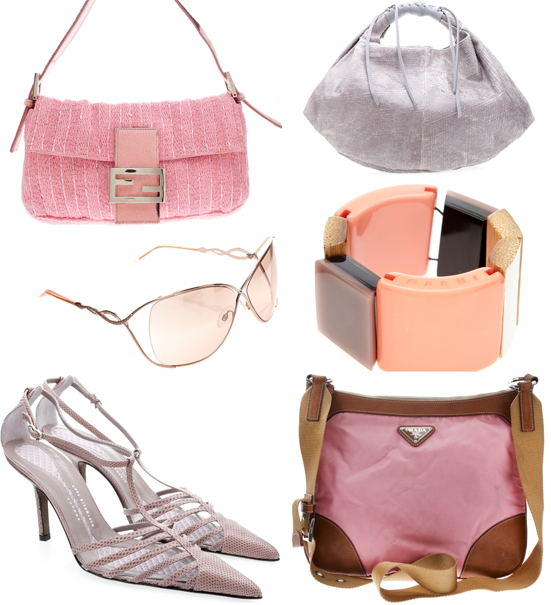 Left to right: Fendi bag, £490, Maison Martin Margiela bag, £280, Roberto Cavalli sunglasses, £56, Marni bracelet, £ 87.50, Anya Hindmarch shoes, £98, Prada, £105