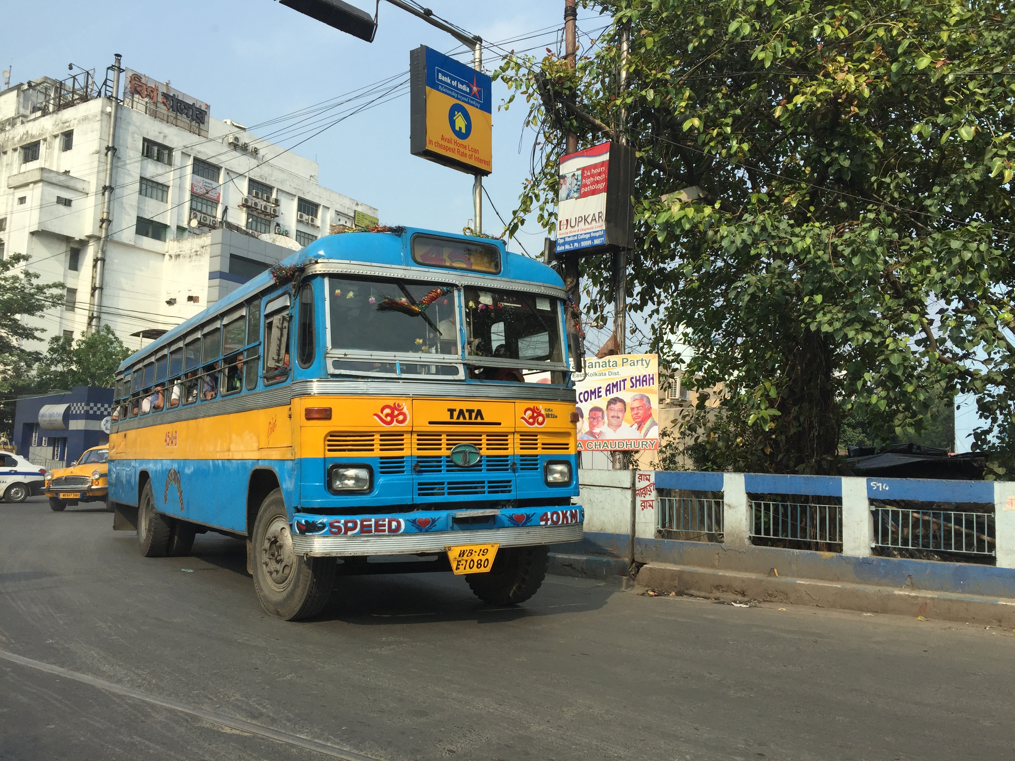 The roads are lined with smart blue and white painted iron railings which adds a cheerful back drop to the vibrant yellow taxi’s and coordinated buses.